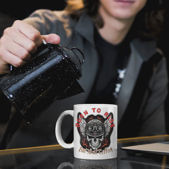 Born To Ride! But First, Coffee! White 11oz Ceramic Mug