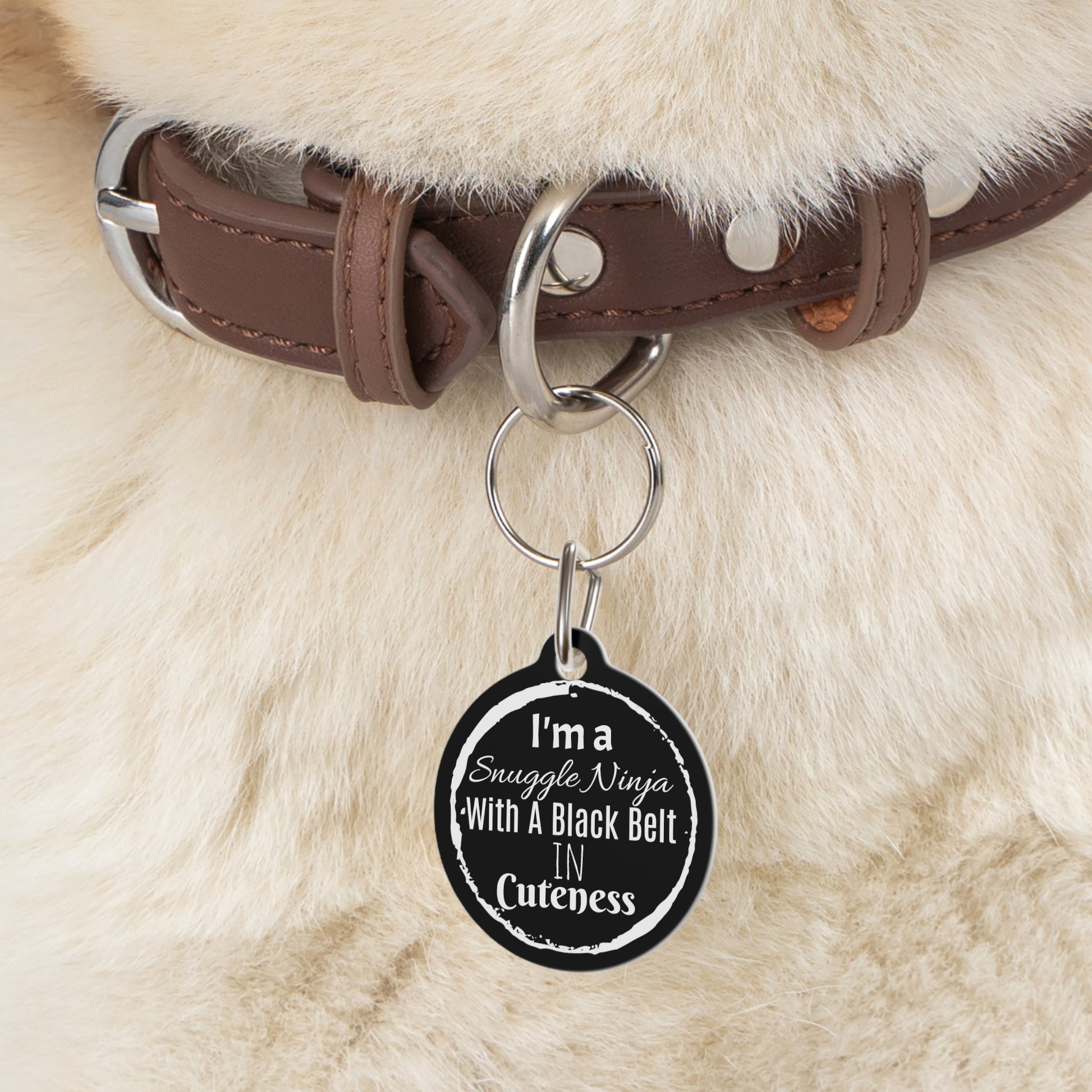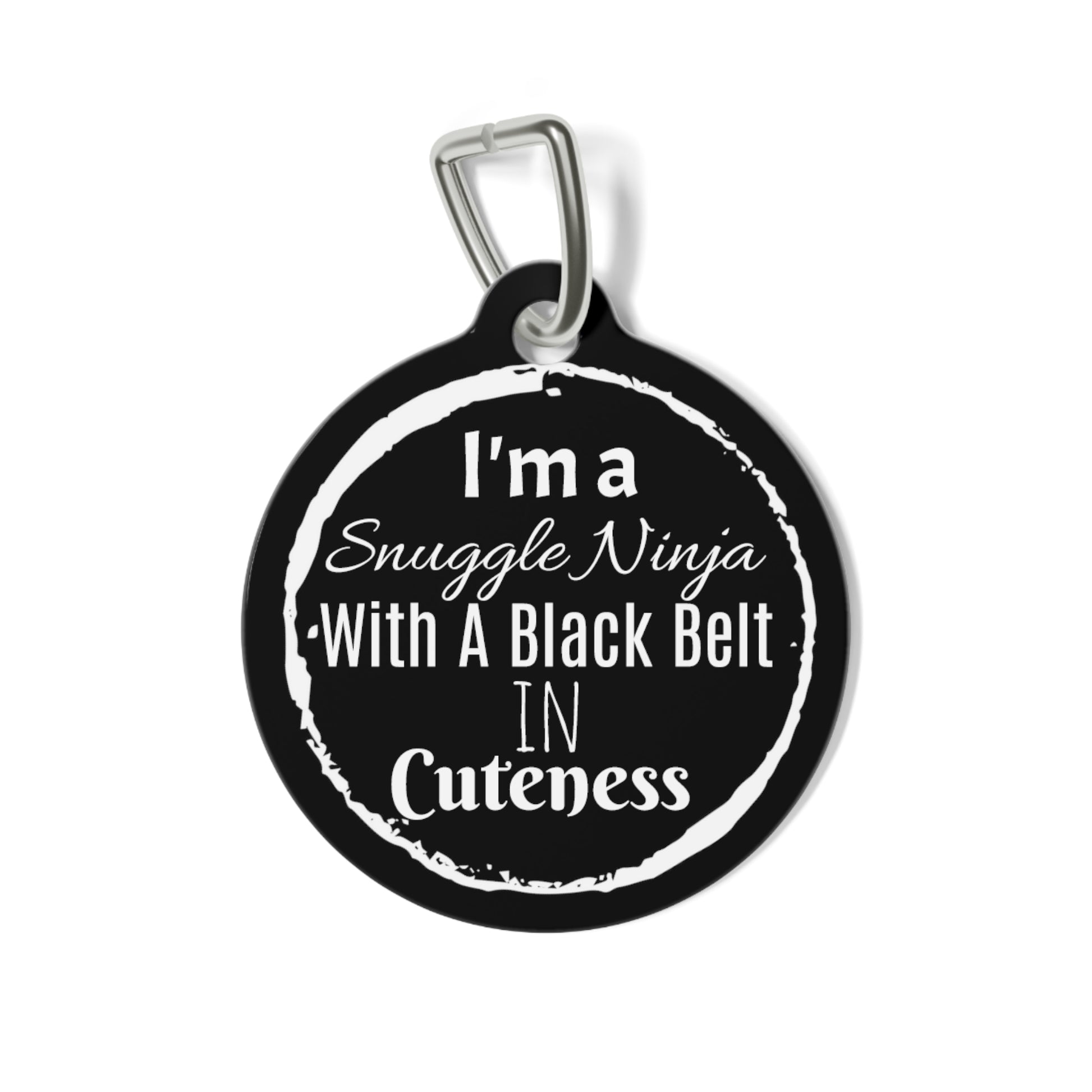 Welcome to our online store, where we proudly present our personalized pet tag that are guaranteed to bring an extra dose of charm to your furry friend! Prepare for some serious cuteness overload with our "I'm a Snuggle Ninja with a Black Belt in Cuteness" tag, because let's face it, your pup is a master in the art of snuggling and an absolute pro at melting hearts. With this playful and witty phrase, your dog will instantly become the cuddliest ninja in town!