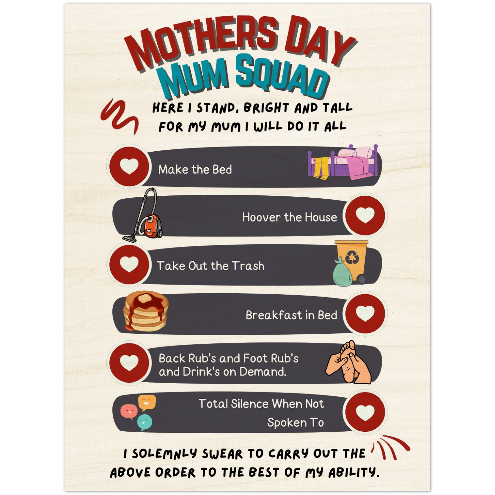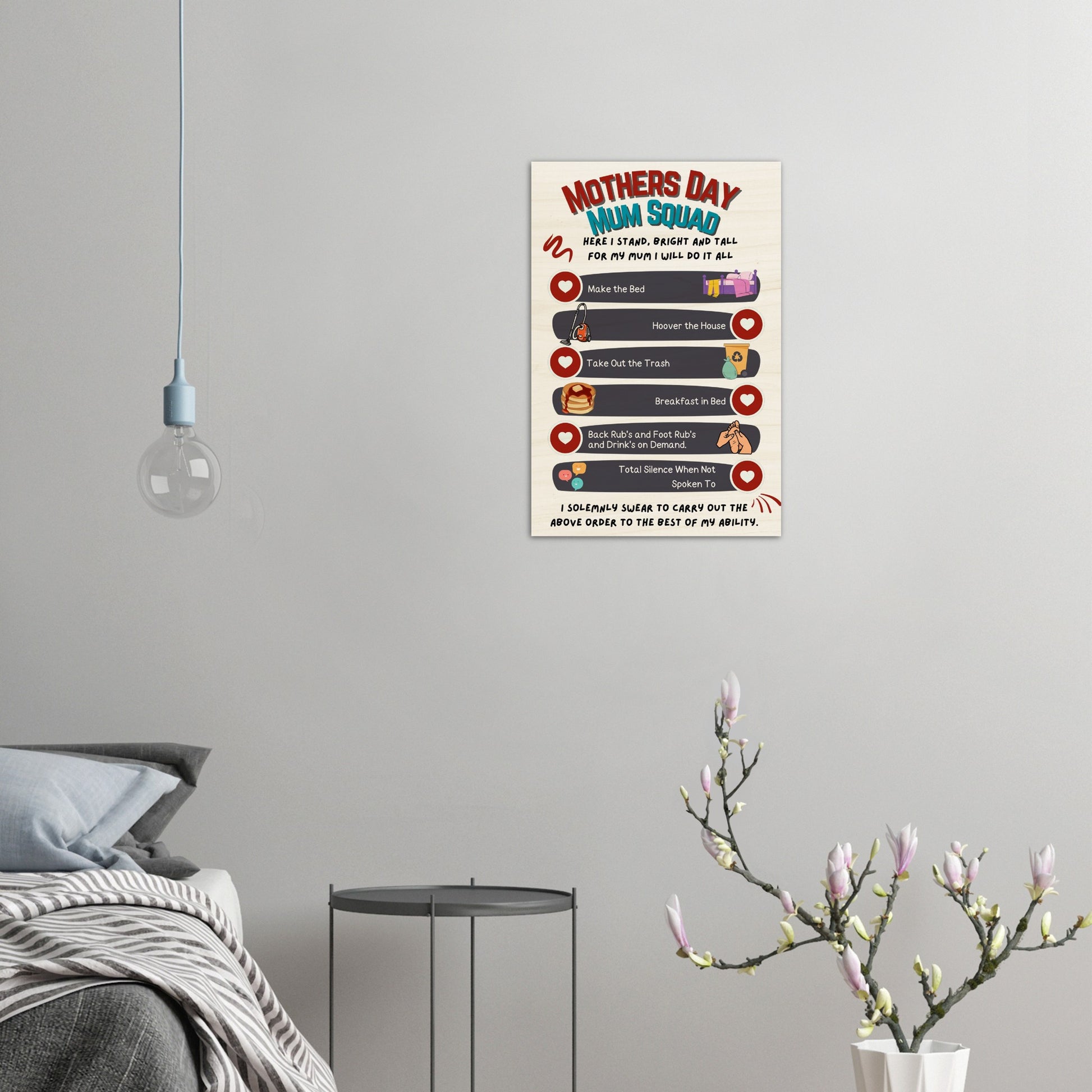 With its adorable "Mum Squad" design, this print is not only a lovely reminder of those promises, but it's also a stylish addition to any room. So why not give the gift of a happier mom this Mother's Day? Order your Wood Print today and make sure those little angels keep their promises!